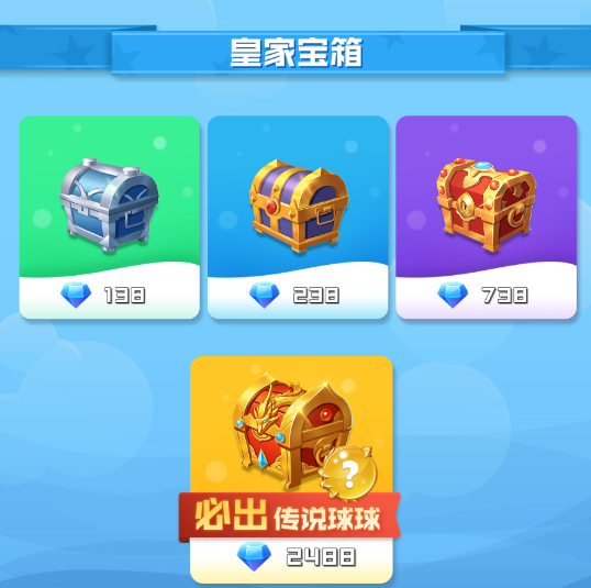 2488鉆石的傳說寶箱必出傳說球球,不過是隨機的;賣738鉆的史詩寶箱是概率出傳說球球,這個就不推薦了。