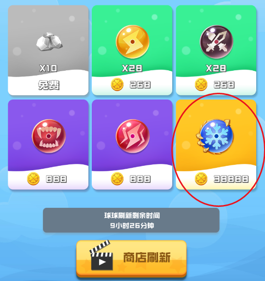 商店刷新6個位置中的右下角位置固定是史詩球球、38888金幣的固定傳說球球或者488鉆石的隨機傳說球球。建議保持自己的金幣有38888以上,鉆石有500以上,這樣一刷到傳說球球就可以立即購買了。