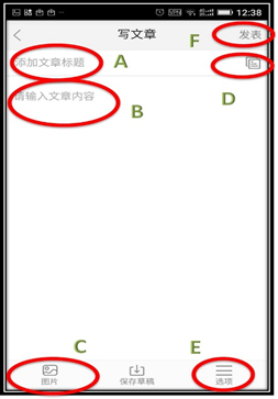 4、在A、B處寫文章,如要配圖,點(diǎn)擊C上傳手機(jī)相冊(cè)中的圖片,點(diǎn)擊D選擇文章所屬類別,點(diǎn)擊E選擇文章是否公開,最后點(diǎn)擊F發(fā)表: