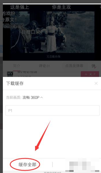 然后再點擊視頻的右上角圖標,在彈出的上拉菜單中,點擊【緩存】,如下圖所示。