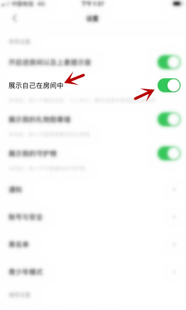 在設(shè)置中,點擊展示自己在房間中的選項后方的開關(guān)。