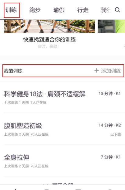在訓(xùn)練頁面往下滑,找到我的訓(xùn)練,對應(yīng)右邊一些有一個添加訓(xùn)練,選擇適合自己的訓(xùn)練課程。