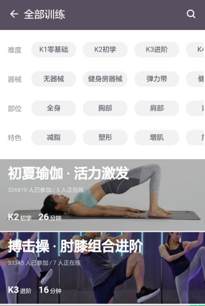 在運動頁面,會看到很多訓(xùn)練方式,包括訓(xùn)練、跑步、瑜伽、行走、騎行等。以訓(xùn)練為例,下面介紹一下怎么使用keep健身。
