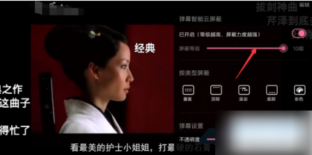 5. 頁(yè)面右側(cè)彈出彈幕設(shè)置菜單后,就能對(duì)屏幕等級(jí)、透明度、字號(hào)顯示區(qū)域等參數(shù)進(jìn)行設(shè)置。全部設(shè)置完后,輕點(diǎn)屏幕就能退出彈幕設(shè)置菜單。