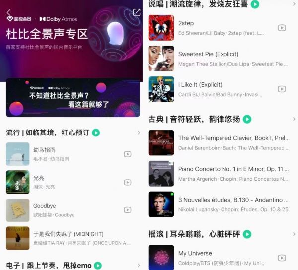 據(jù)了解,目前超級(jí)會(huì)員用戶使用支持杜比全景聲的安卓手機(jī),登錄 QQ 音樂(lè) 11.8 新版本搜索“杜比 / 杜比全景聲”可進(jìn)入專區(qū),來(lái)聆聽(tīng)包括毛不易、周深、五月天、蕭敬騰、袁婭維、歐陽(yáng)娜娜、INTO1、Ed Sheeran、Coldplay、Roddy Ricch、Sia 等全球備受歡迎的歌手、樂(lè)隊(duì)、音樂(lè)人的杜比全景聲歌曲,涵蓋了流行、古典、搖滾、電子、說(shuō)唱等各種音樂(lè)類型。雙方表示后續(xù)將繼續(xù)合作,將杜比全景聲拓展到更多場(chǎng)景。