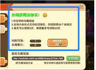 在迷你世界中,想要快速獲得迷你豆,玩家可以把自己的專屬鏈接其他平臺(tái),其他小伙伴點(diǎn)擊你的鏈接后,玩家就獲得20個(gè)迷你豆,每天可以領(lǐng)取5次,每周最多可領(lǐng)取20次,也就是400個(gè)迷你豆。