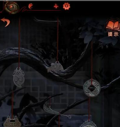 2、回到庭院點擊樹上的紙幣,按下圖完成調(diào)整獲得發(fā)條鑰匙。