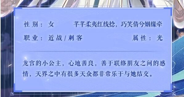 龍吉的稱號(hào)紅鸞星使,是一名近戰(zhàn)刺客,光屬性。她是龍宮中一個(gè)特別善良的小公主,喜歡聯(lián)絡(luò)朋友之間的感情,天界之中有許多天眾都非常喜歡與她結(jié)交。