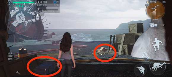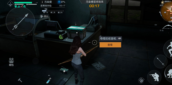 1.首先是來到了我們的出生點,就是這個界面,在我們的左手邊有一個箱子,里面有稿子,斧頭,刀和弓箭,這個是必須拿的,緊接著把地上的木板給拿了,木頭和石頭都是后面必需品,然后去旁邊挖點石頭,就可以準備去上面的農場里面搜索物資,抗污染藥劑(白天增加1點污染度。晚上在外面是增加4點,在屋里面增加1點)這個是必須品,然后就是繃帶可以回復50點生命。