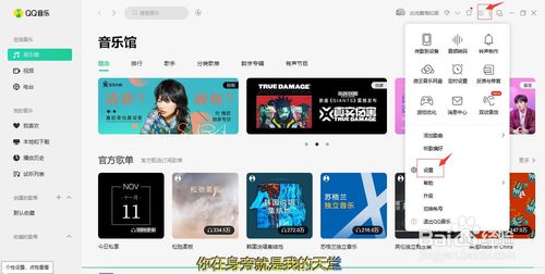 在QQ音樂(lè)軟件主界面,在頂端右邊有個(gè)三橫的圖標(biāo)即“主菜單”,點(diǎn)擊這個(gè)圖標(biāo),在彈出的菜單里點(diǎn)擊“設(shè)置”選項(xiàng)。