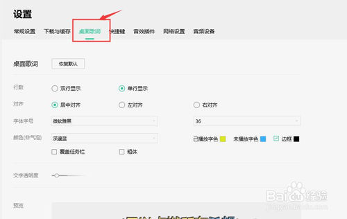 在設(shè)置頁(yè)面,切換到“桌面歌詞”標(biāo)簽,即可對(duì)桌面歌詞進(jìn)行設(shè)置,包括歌詞顏色,字體,字號(hào)等。