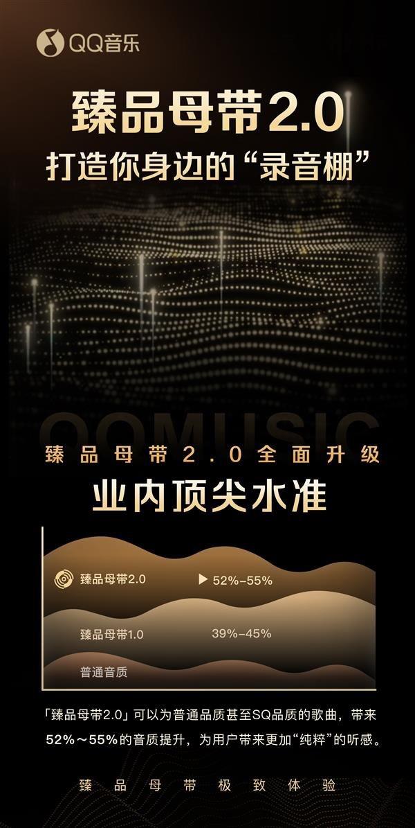 據(jù) QQ 音樂官方消息,臻品母帶音質(zhì)現(xiàn)已“進階”到 2.0 版本,帶來高達 55% 音質(zhì)提升。