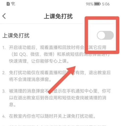 進(jìn)入上課免打擾界面中,點(diǎn)擊關(guān)閉【上課免打擾】右側(cè)開關(guān)即可。