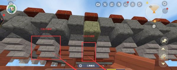 1.房檐呢,肯定是要突出柱子外面去的,所以我會在柱子的頂端然后往外延伸4個石塊,然后以第5個石塊為最外面一圈,第一圈我是用的石塊。我還用了一個不同的顏色來做四面共同的邊,其實不換顏色也可以。