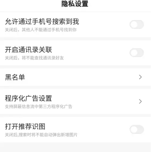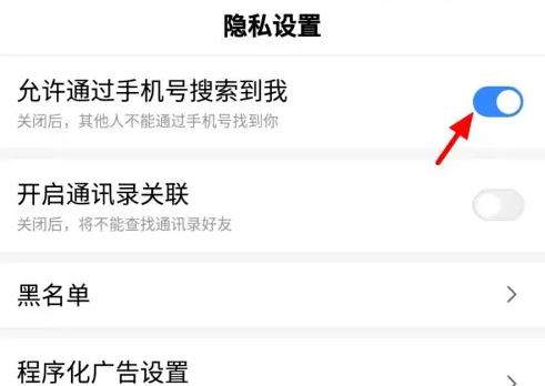 進(jìn)入隱私設(shè)置頁面后,關(guān)閉 允許通過手機(jī)號搜索到我 ;