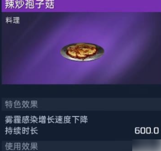 在家園烹飪中,如果能收集4個鮮艷孢子菇,放進去就可以得到最終辣炒孢子菇,將劇毒而美麗的孢子菇,經過烹飪之后就變成了可口料理。因為食材稀有,所以得到品質直接就是紫色?;A效果為提高56點飽食度和14點飲水度,基本上吃一個就能將飽食度恢復一半,但最關鍵依然是自己特色效果,使用者霧霾感染增長速度下降,持續(xù)600秒。