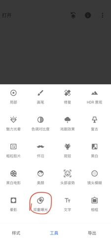 3.打開(kāi)圖片點(diǎn)一下下方的工具按鈕后從眾多工具中選擇“雙重曝光”。