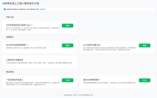 微信小程序正式推出「AI應(yīng)用及線上工具小程序成長計劃」。提供云開發(fā)資源、AI算力、數(shù)據(jù)分析、商業(yè)變現(xiàn)及流量激勵等全方位支持,陪伴開發(fā)者完成從“0到1”再從“1到100”。