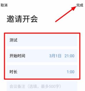 設(shè)置會(huì)議主題,設(shè)置開始的具體的日期和具體的時(shí)間,設(shè)置會(huì)議的時(shí)長(zhǎng),如果有什么說明也可以在會(huì)議備注里要填寫,點(diǎn)擊“完成”。
