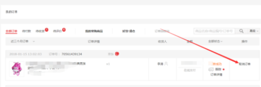 4、進(jìn)入京東我的訂單里,找到要退款的訂單,然后直接點擊后面的【取消訂單】,如下圖所示。