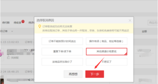 5、點擊取消訂單后,彈出取消訂單的原因,隨便選擇一個,然后點擊下一步,如下圖所示。