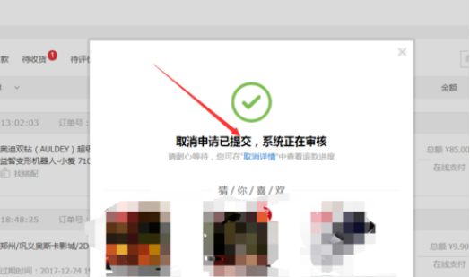 7、點擊取消訂單退款已提交,系統(tǒng)正在審核,如下圖所示。