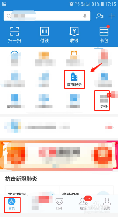 首先在手機中打開支付寶,進入支付寶首頁,點擊上方的常用應用中的“城市服務”,如果沒有,點擊“更多”,在便民生活中點擊城市服務。