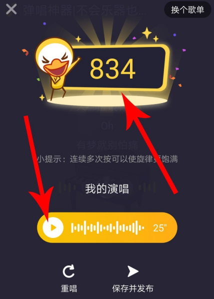 彈唱完畢后,唱鴨會給出評分,點擊“播放”按鈕可以聽聽自己彈唱的效果