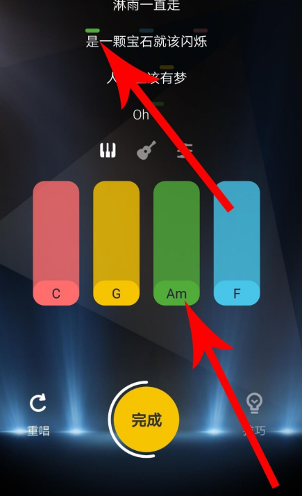 接著根據(jù)歌詞唱歌,當(dāng)唱到“淋”字時根據(jù)紅線提示點擊“C”,這樣就會發(fā)出聲音