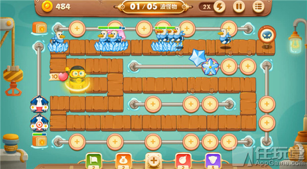 1、開局如圖所示,建兩個玩具飛機和一個冰凍星??刂仆婢唢w機打下方的寶箱。前兩波怪物交由冰凍星對付,飛機偶爾支援下即可。把寶箱打下來后,利用這些錢在中間滑道上再建一個冰凍星,其他的錢在四周建飛機。