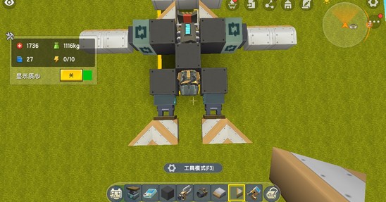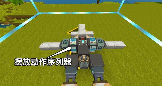 之后我們在駕駛座后面擺放無限引擎,并且在引擎兩邊安裝轉(zhuǎn)軸方塊和機翼: