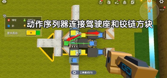 四個動作序列器都鏈接一下駕駛座,兩個動作序列器各自連接一個機翼部分的轉(zhuǎn)軸方塊,另外兩個動作序列器各自鏈接一個尾翼部分的鉸鏈方塊: