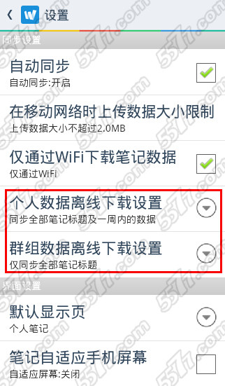 在設(shè)置界面中,選擇【個(gè)人數(shù)據(jù)離線下載設(shè)置】或者【群組數(shù)據(jù)離線下載設(shè)置】,將我們手機(jī)中對(duì)應(yīng)的筆記設(shè)置離線下載。